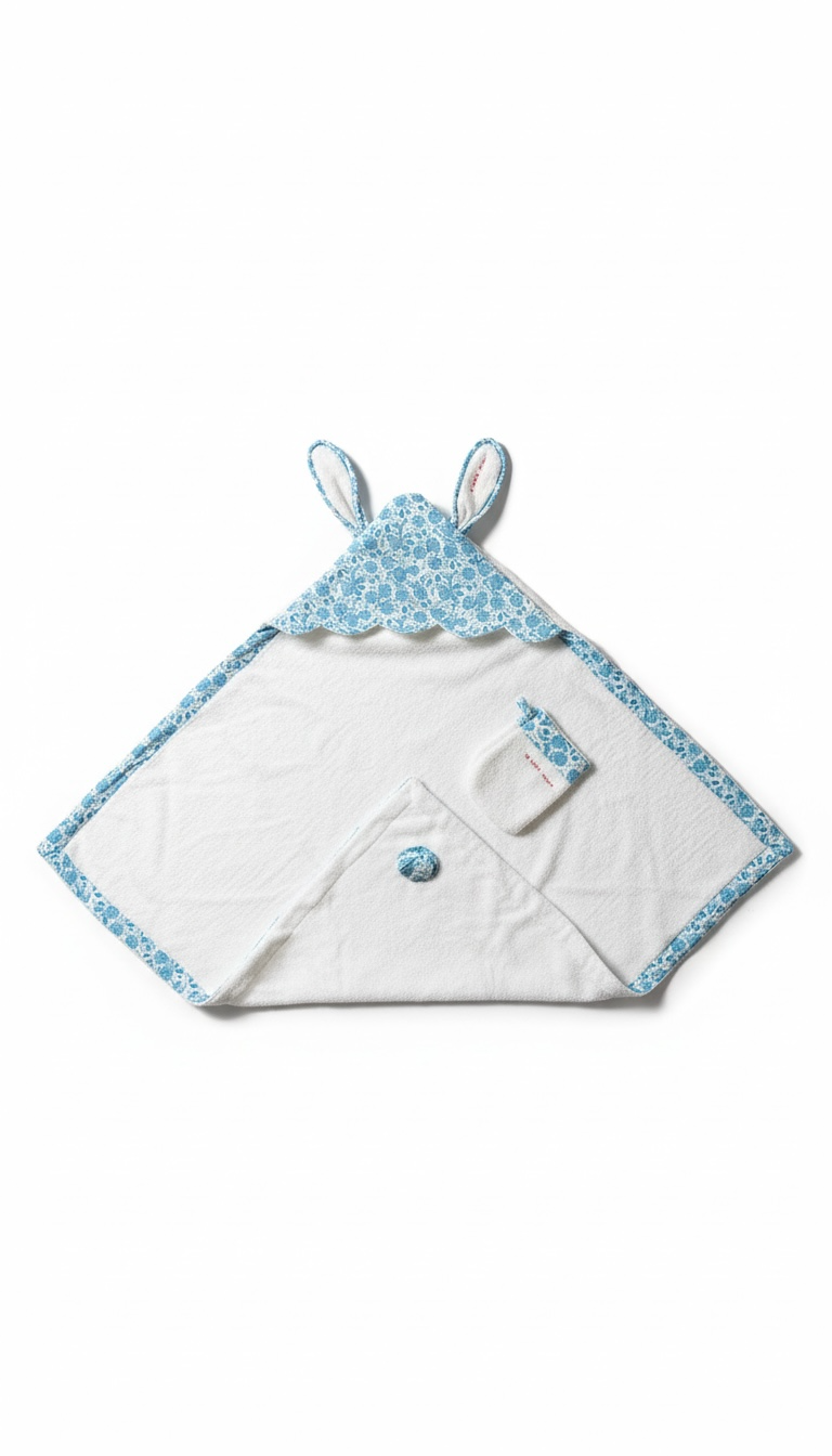 Welcome your baby into the soft embrace of this terry cotton bathrobe. Featuring a scalloped hood and Born to Be Whimsical fabric trim with ears and tail, this bathrobe comes with a matching washcloth. A lovely gift idea for a new baby, add this chic and colourful duo to your hospital bag.